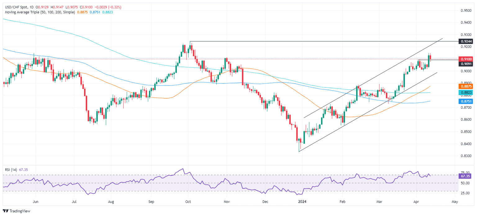 The USD/CHF retreats from year-to-date (YTD) highs reached on Wednesday and drops below the 0.9100 figure as risk appetite improves. The major trades were down by 0.9099 by 0.32%.