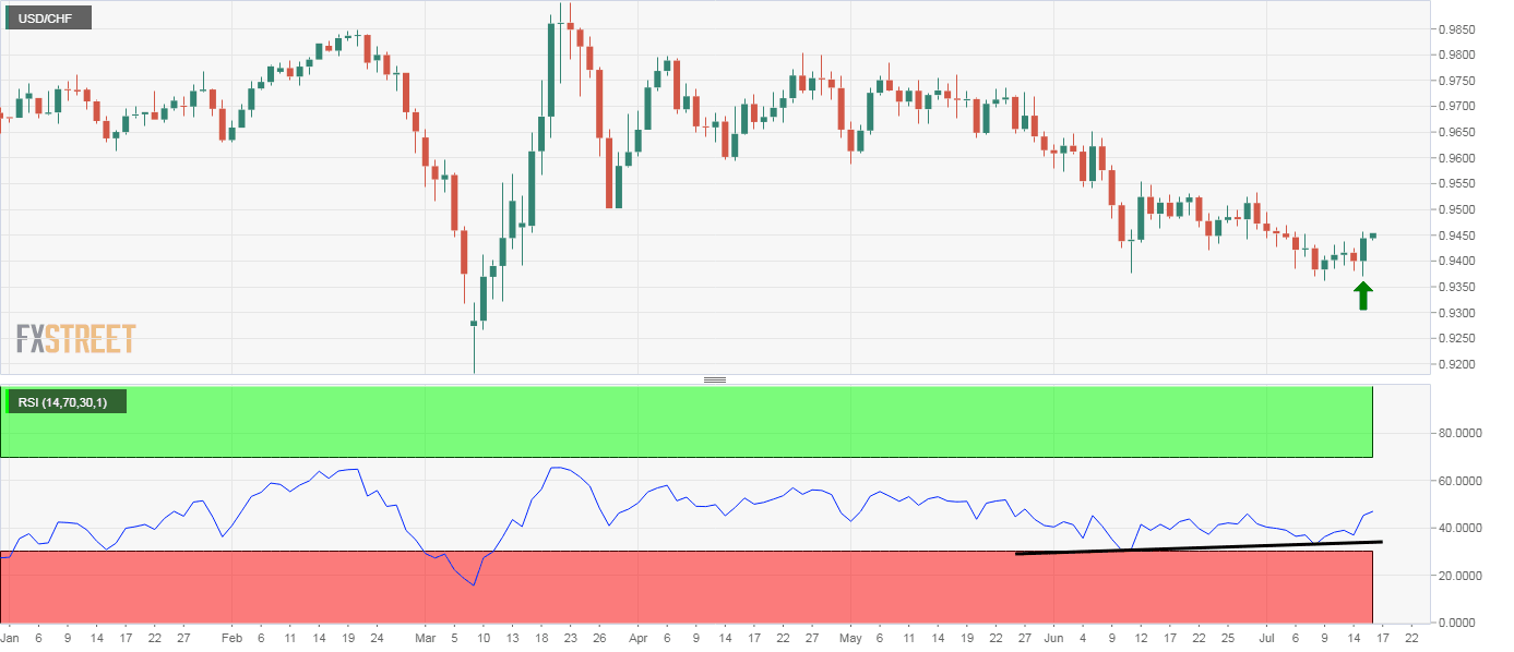 - USD/CHF's daily chart shows a bullish candlestick pattern and RSI divergence.