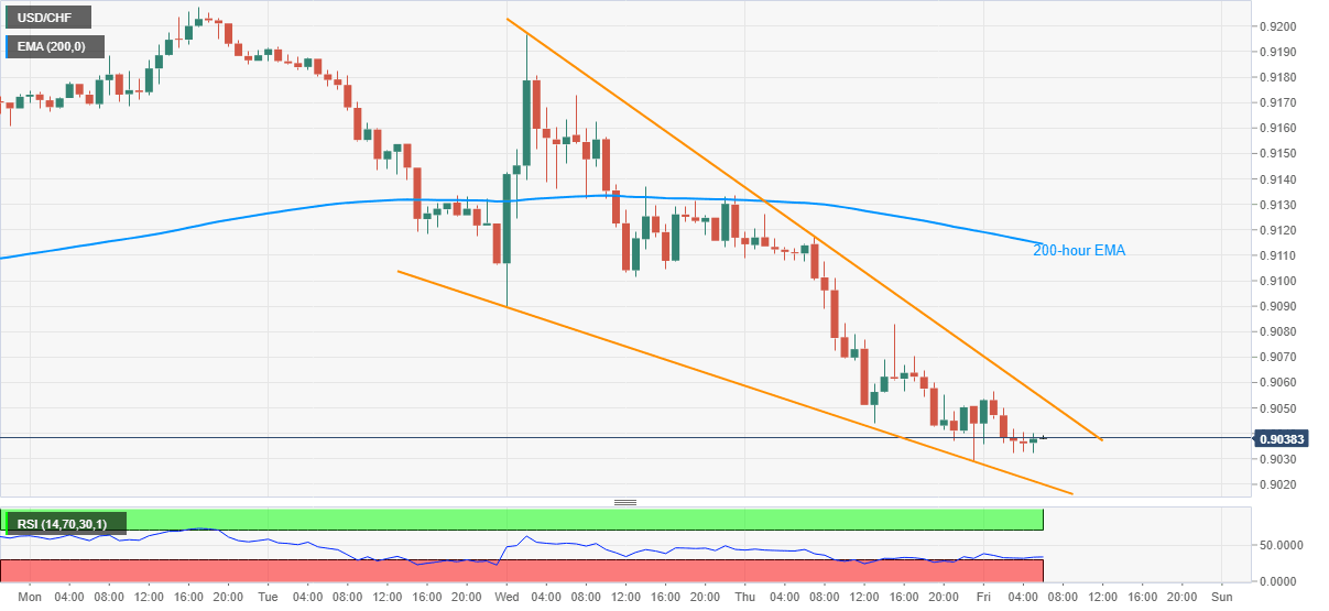 Having marked a downtick below October 21 bottom to test the September-start low, USD/CHF wavers near 0.9038, down 0.07% intraday, while heading into Friday’s European open.