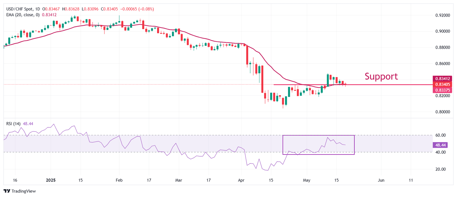USD/CHF gauges cushion near the horizontal support plotted from the April 25 low of 0.8335, which used to be a major resistance for the pair. The asset wobbles around the 20-day Exponential Moving Average (EMA), which trades around 0.8340, indicating a sideways trend.