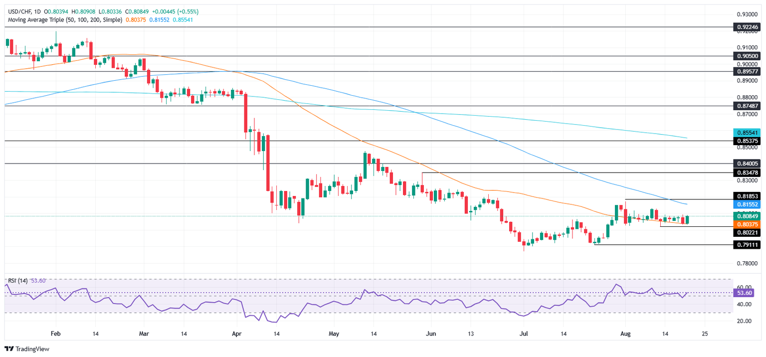 - USD/CHF up 0.56%, trades at 0.8087 after clearing 20-day SMA at 0.8076.