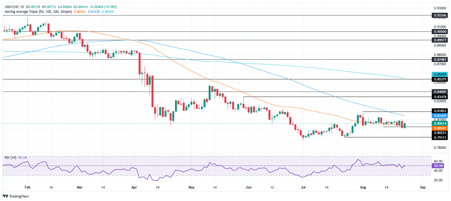 The Relative Strength Index (RSI) hovers around its neutral line, further confirming the USD/CHF consolidation around current exchange rates. But, as the pair hit a lower low of 0.8000, last seen on July 28, a test of the latter is on the cards.