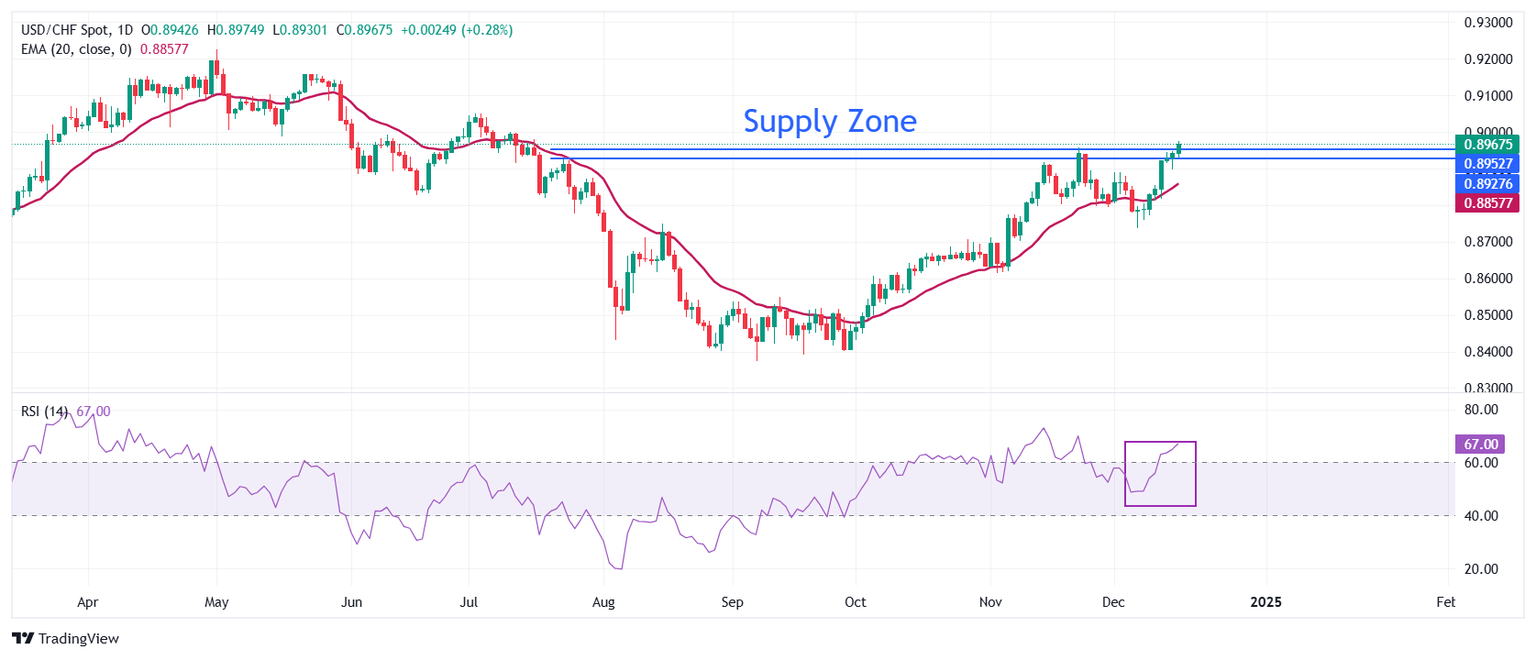 The USD/CHF pair stretches its winning spell for the eighth trading day on Tuesday. The Swiss Franc pair posts a fresh five-month high around 0.8970 as the Swiss Franc (CHF) remains weak across the board on expectations that the Swiss National Bank (SNB) could continue loosening its monetary policy to avoid risks of inflation undershooting the central bank’s target.