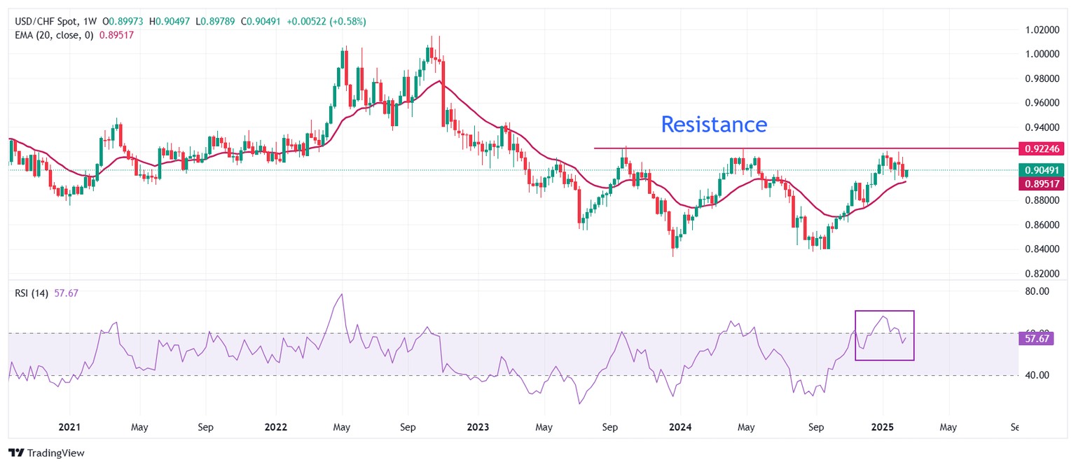 USD/CHF strives to revisit its 15-month high, around 0.9200. The outlook of the Swiss Franc pair remains firm as the 20-week Exponential Moving Average (EMA) near 0.8950 is sloping higher.