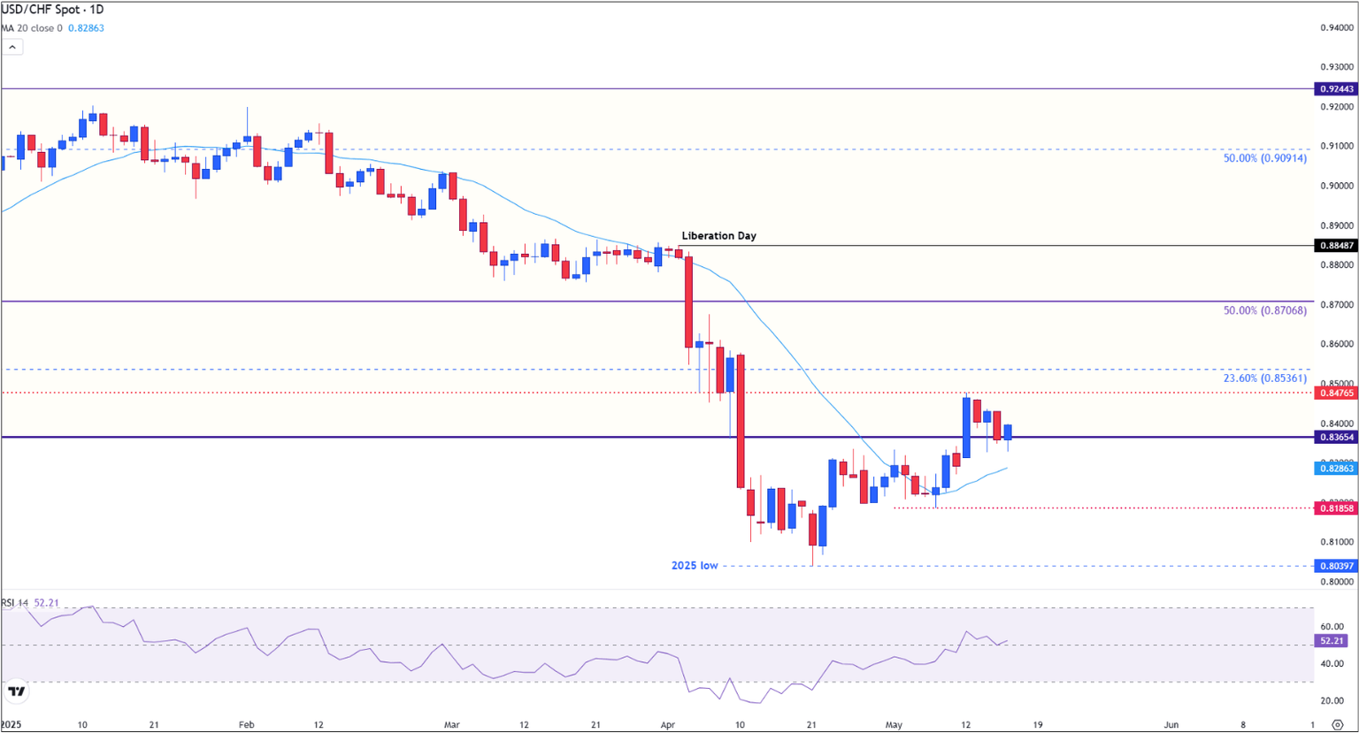 The daily chart shows that USD/CHF is consolidating just below the 0.8536 barrier after rallying from the April low at 0.8039. Price action remains supported by a rising 20-day SMA, currently at 0.8285, while a pattern of higher lows signals ongoing demand. Still, momentum is waning, with the Relative Strength Index (RSI) stabilizing near 51.2 – a neutral reading that reflects a balanced, but indecisive, market.