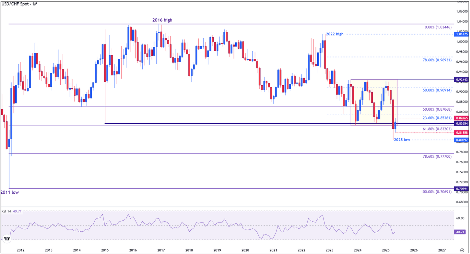USD/CHF found strong support on April 21 near 0.8040 — its lowest level since 2015 — and has since begun to recover. This bounce came just below a key long-term Fibonacci retracement level near 0.8320, which has historically acted as a major turning point for the pair. Notably, this same zone helped stabilize prices during the 2015–2016 consolidation, adding weight to its importance as a structural base.