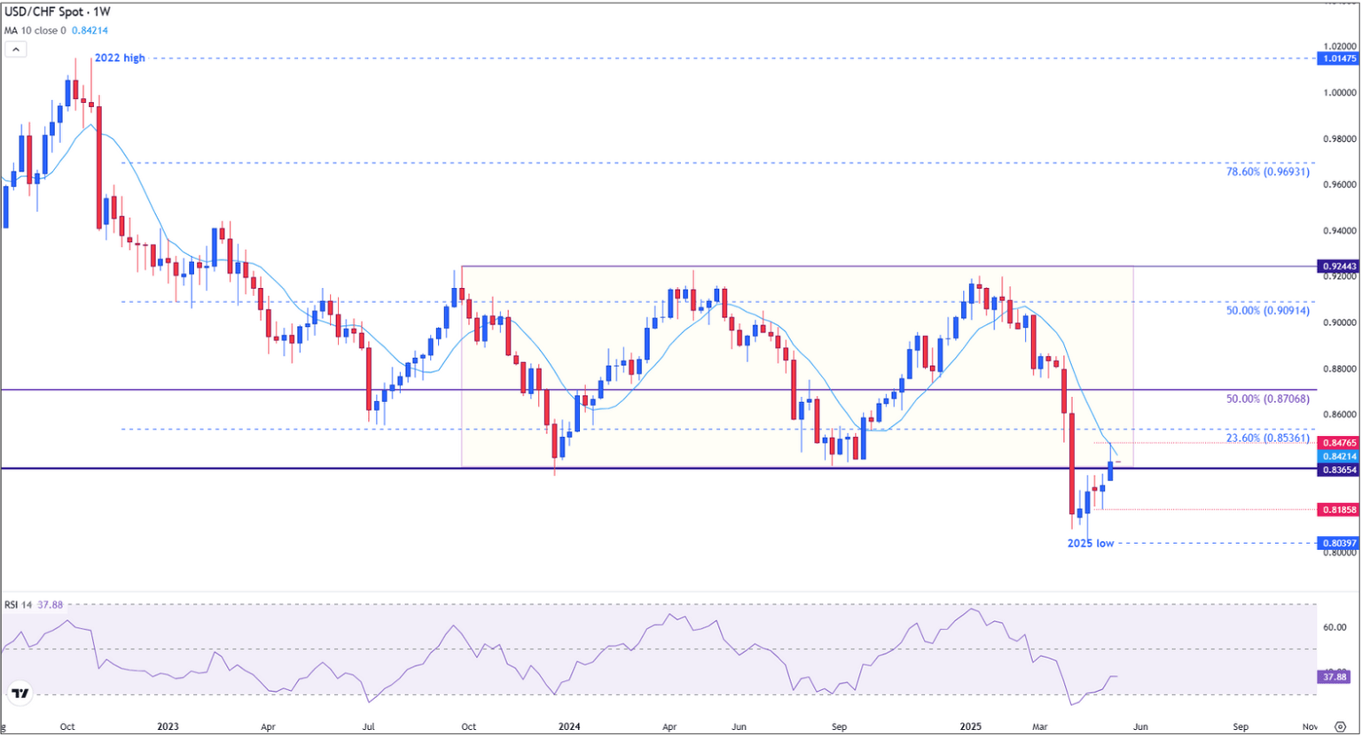 On the weekly time frame, USD/CHF has posted three consecutive bullish candles, reflecting a recovery from oversold conditions. The pair is testing the 10-week Simple Moving Average (SMA) near 0.8419, which has acted as dynamic resistance since March. The broader 0.8419-0.8536 zone is technically dense, representing a former support region from 2023 that failed earlier this year.