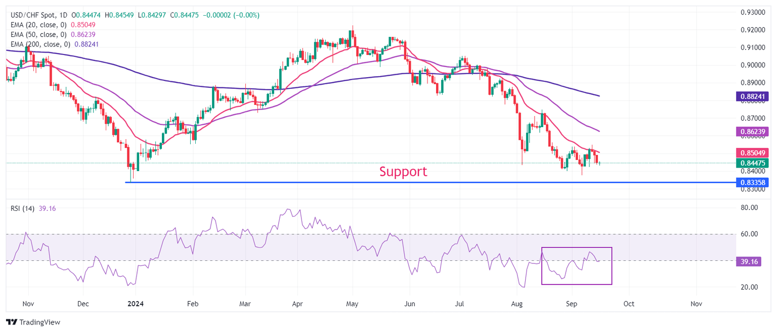 The USD/CHF pair extends its losing streak for the fourth trading session on Tuesday. The Swiss Franc asset remains sluggish near 0.8450 as the US Dollar (USD) continues to face selling pressure due to growing market expectations that the Federal Reserve (Fed) will deliver a 50 basis points (bps) interest rate cut on Wednesday.