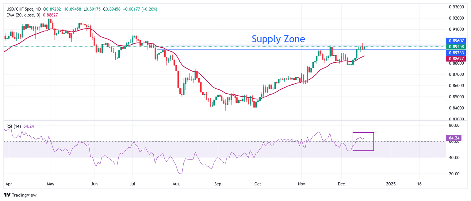 USD/CHF gathers strength to break above the supply zone plotted in a range of 0.8925-0.8950 on a daily timeframe. The upward-sloping 20-day Exponential Moving Average (EMA) near 0.8860 suggests that the trend is bullish.