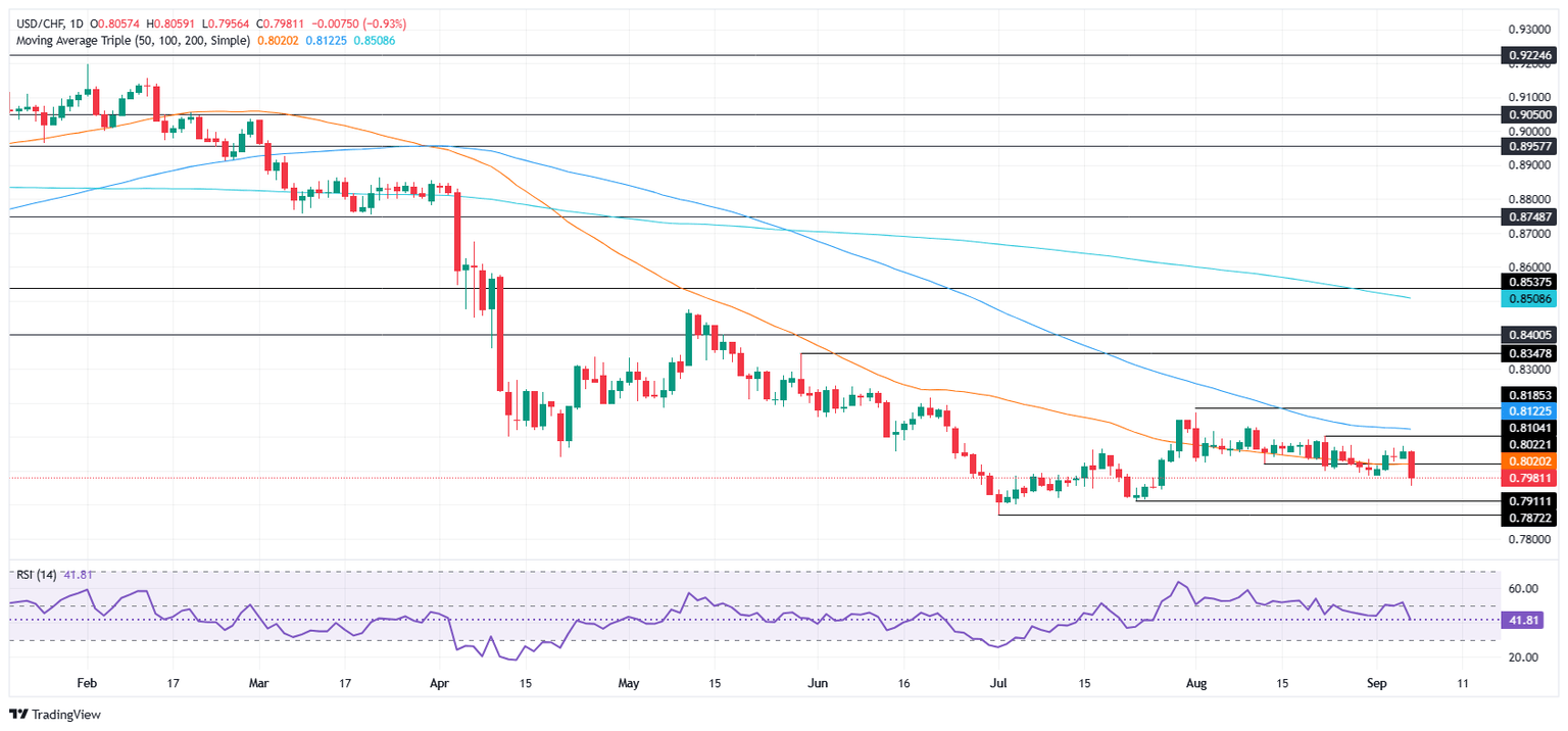 The USD/CHF extended its losses on Friday, tumbling below the 50-day Simple Moving Average (SMA) at 0.8020. The release of a worse than expected US Nonfarm Payrolls report, cemented the case for a Fed rate cut at the September meeting. At the time of writing, the pair trades at 0.7980, down 0.94%.