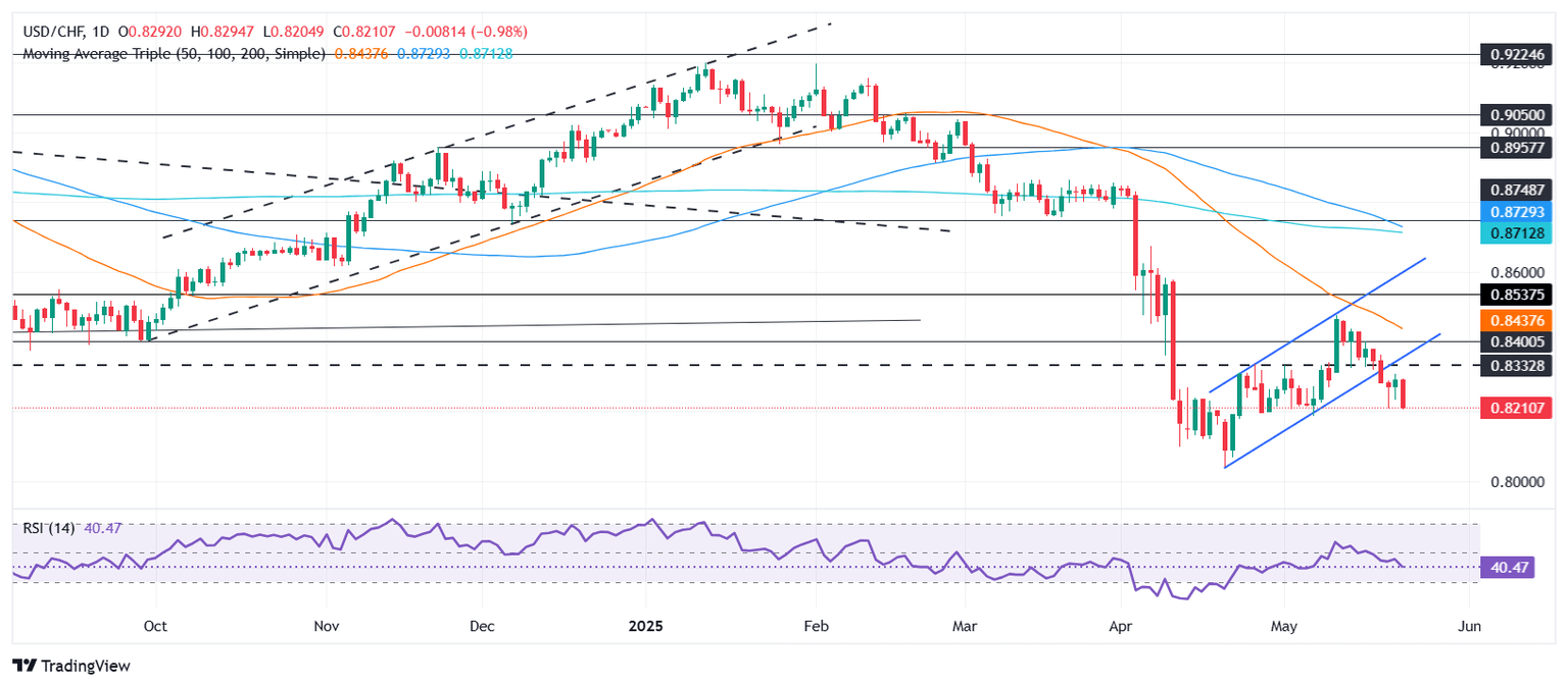 USD/CHF continues to weaken as the downtrend extends past 0.8250, as the pair loses almost 1%. Investors seeking safety bought the Swiss Franc (CHF) after US President Donald Trump threatened to enact tariffs of 50% on the European Union (EU) and 25% on Apple’s iPhone manufactured overseas. At the time of writing, the pair trades at 0.8203, at new two-week lows.