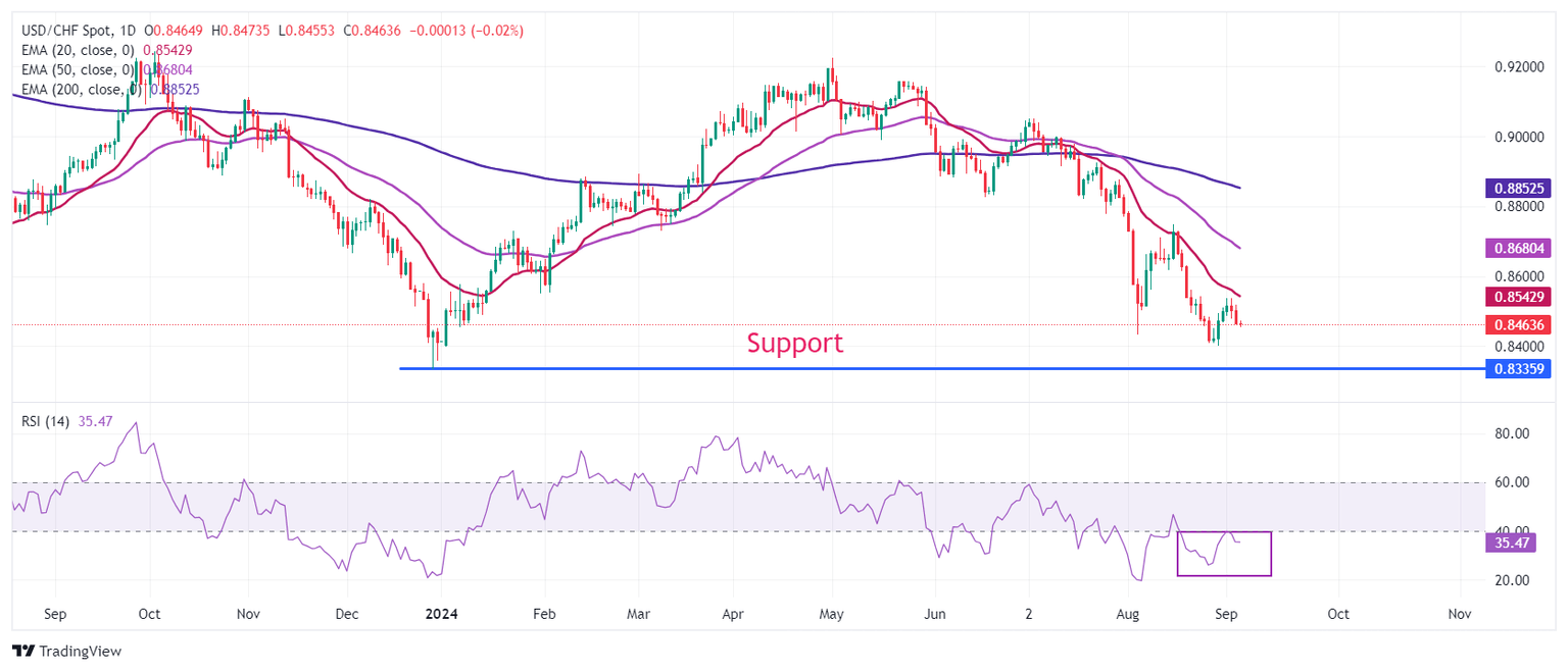 USD/CHF declines toward the horizontal support plotted from 28 December 2023 low of 0.8333 on a daily timeframe. The near-term and broader-term outlooks of the Swiss Franc asset remain bearish as all short-to-long-term Exponential Moving Averages (EMAs) are declining.