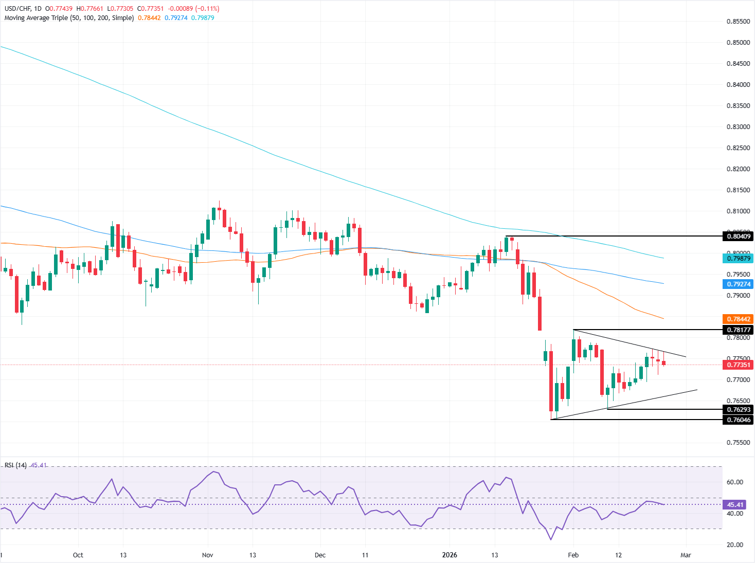 USD/CHF edges lower during the North American session on Tuesday, down 0.20%, even though the US Dollar (USD) posted solid gains against most of its peers, except the Swiss Franc (CHF). At the time of writing, the pair trades at 0.7733 and tests key support at the 20-day Simple Moving Average (SMA) at 0.7723.