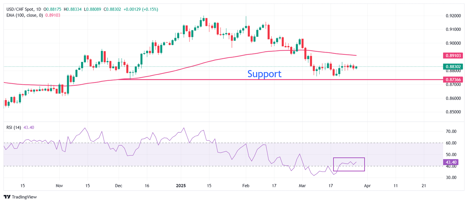 The USD/CHF pair ticks higher to near 0.8830 but trades inside Thursday’s trading range in Friday’s North American session ahead of the United States (US) Personal Consumption Expenditure Price Index (PCE) data for February, which will be published at 12:30 GMT.