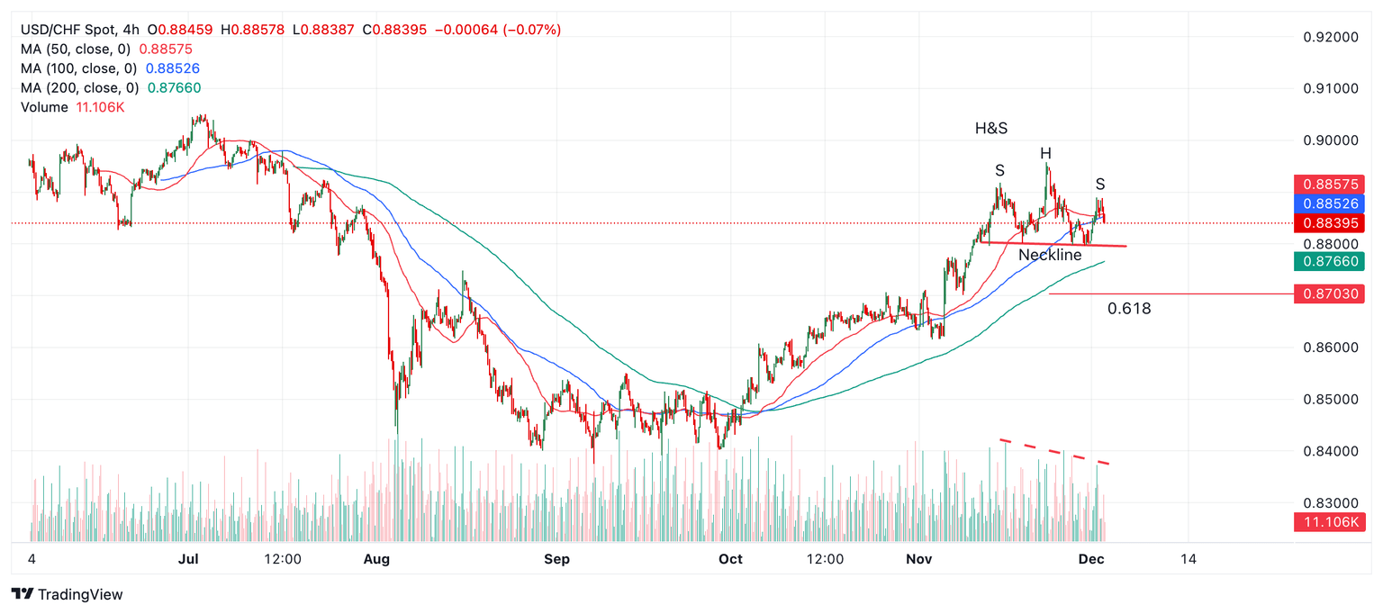 USD/CHF has likely formed a bearish Head and Shoulders (H&S) reversal pattern on the 4-hour chart, which, if valid, indicates a probable decline is on the cards for the pair.
