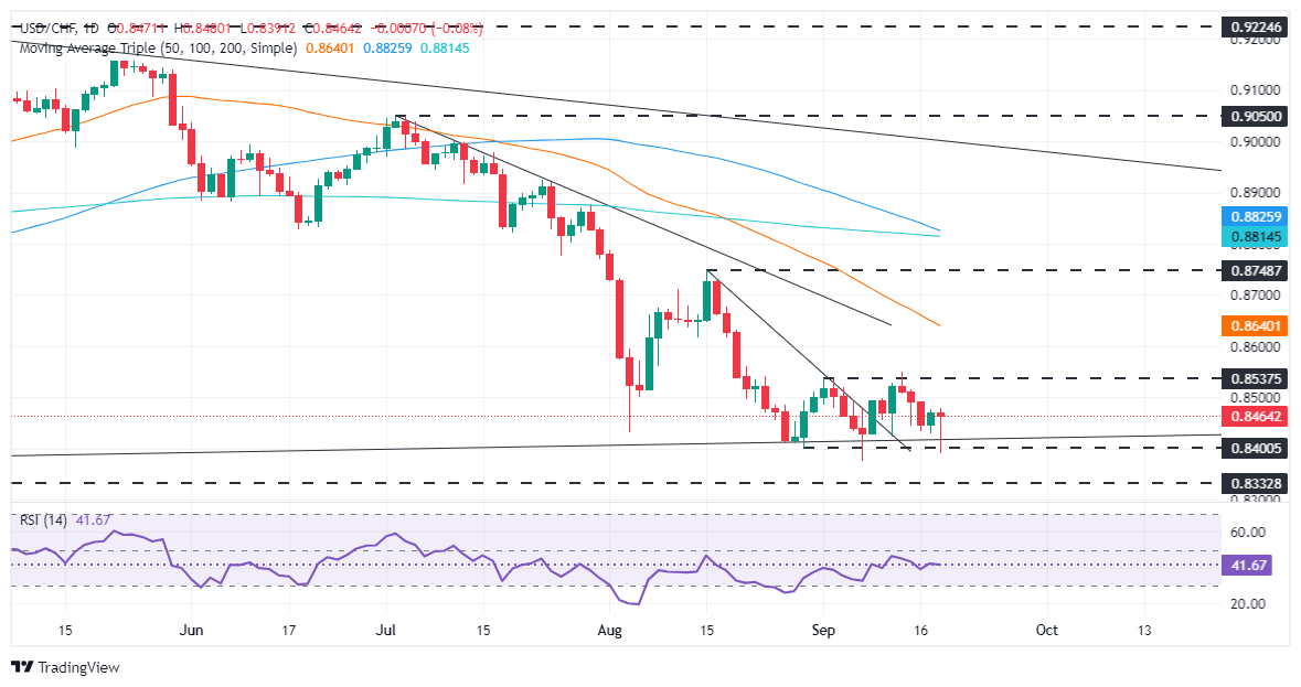 The USD/CHF recovered after whipsawing after the Federal Reserve lowered borrowing costs by 50 basis points (bps), though it reaffirmed its data-dependent stance, according to Chairman Jerome Powell. At the time of writing, the major trades were at 0.8459, slightly down to some 0.14%.