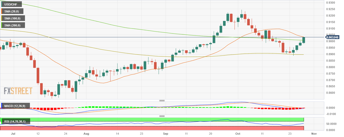 - The USD/CHF rose to a two-week high around 0.9035 near the 20-day SMA.