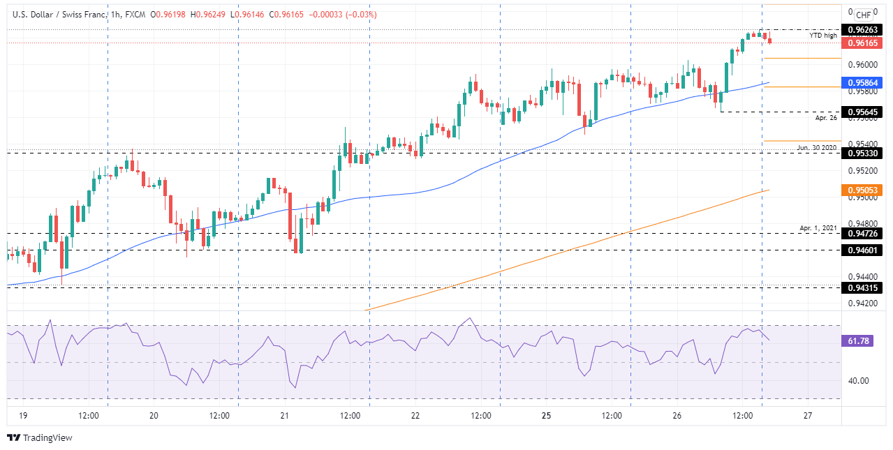 On Tuesday, the USD/CHF rallied for the third consecutive day and reached a 21-month high at 0.9626. However, as the Asian Pacific session begins, the USD/CHF print modest losses of 0.06%, down from YTD highs, and is trading in the high 0.9610s at the time of writing.