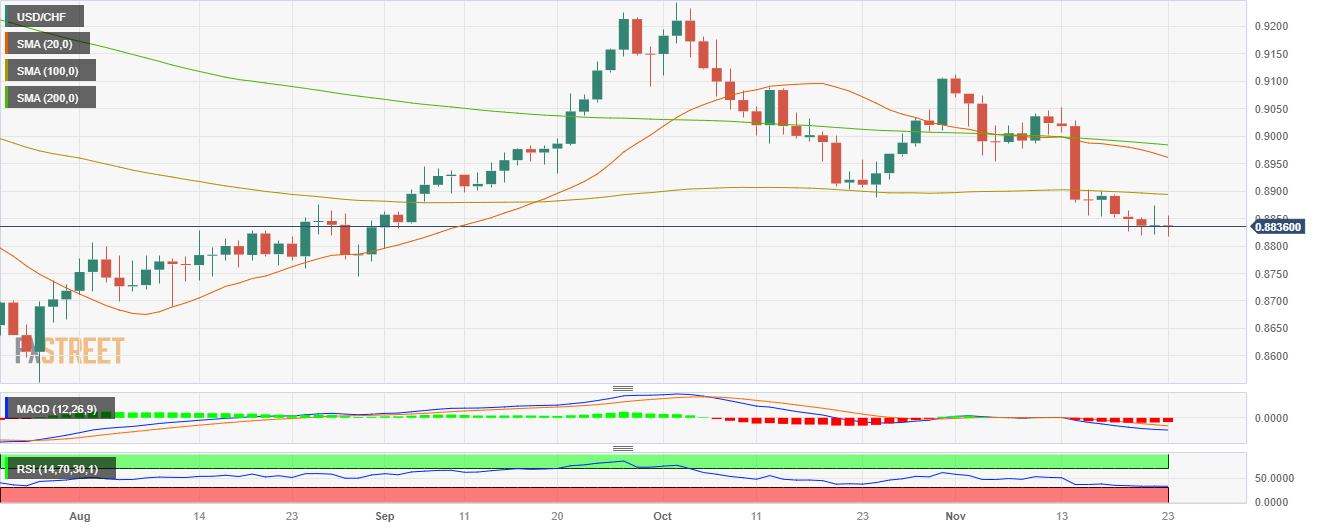 On Thursday, the USD/CHF pair experienced minor losses, nudging lower to trade around the 0.8835 mark. The marginal downtrend primarily stemmed from a relatively muted session, with the American traders on the sidelines celebrating Thanksgiving.