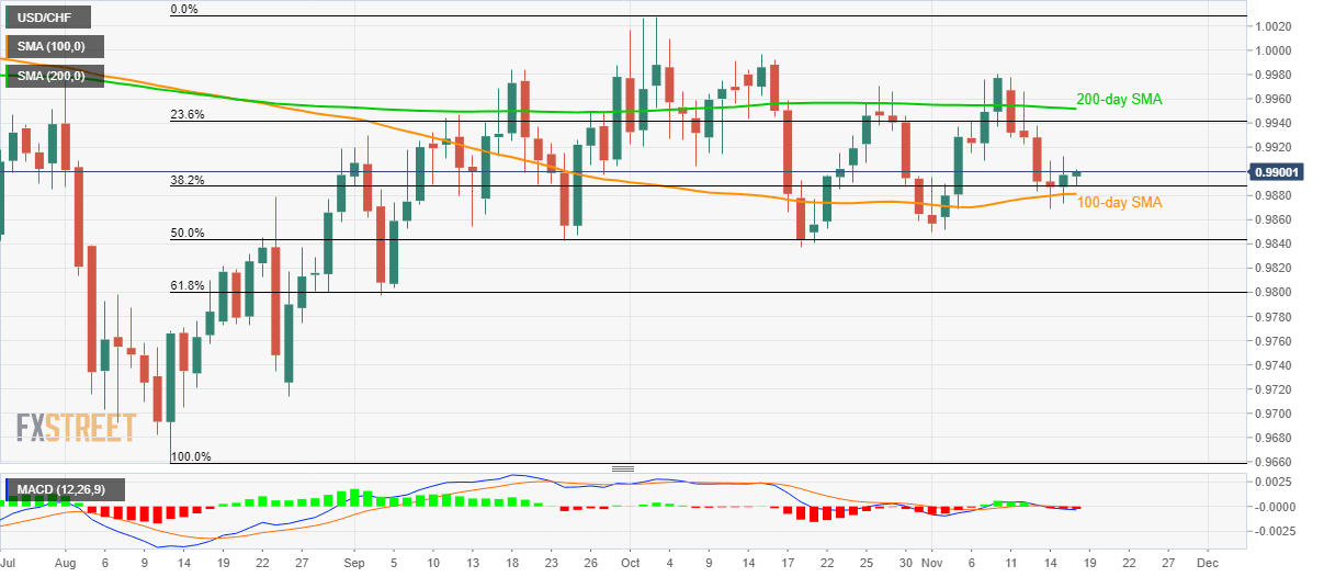 Following its bounce off 100-day SMA, USD/CHF rises past-38.2% Fibonacci retracement of August-October upside while taking the bids to 0.9900 by the press time ahead of the European session on Monday.
