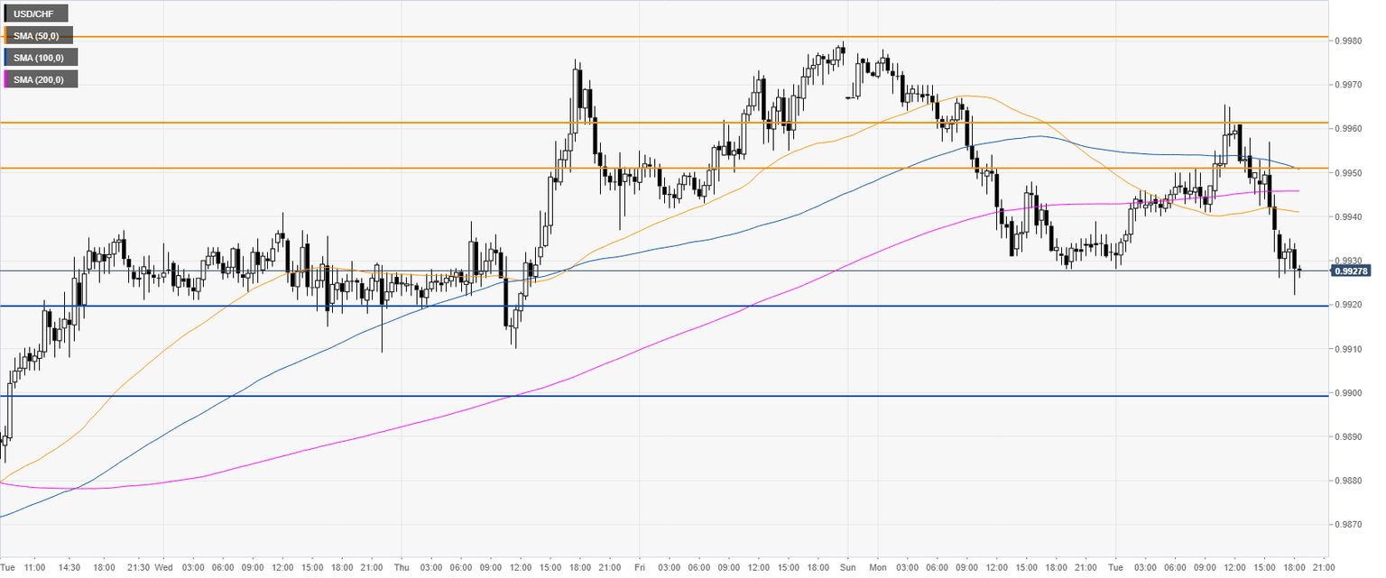 On the daily chart, USD/CHF is trading in a range below its 200-day simple moving average (DMA). The spot is holding just above the 50 SMA today at the 0.9921 level.