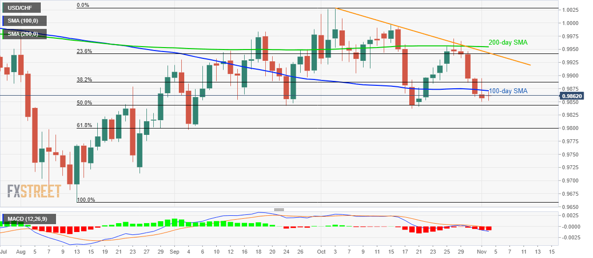 With its yet another bounce off 50% Fibonacci retracement of August-October advances, USD/CHF nears 100-day Simple Moving Average (SMA) while taking the bids to 0.9865 amid initial trading on Monday.