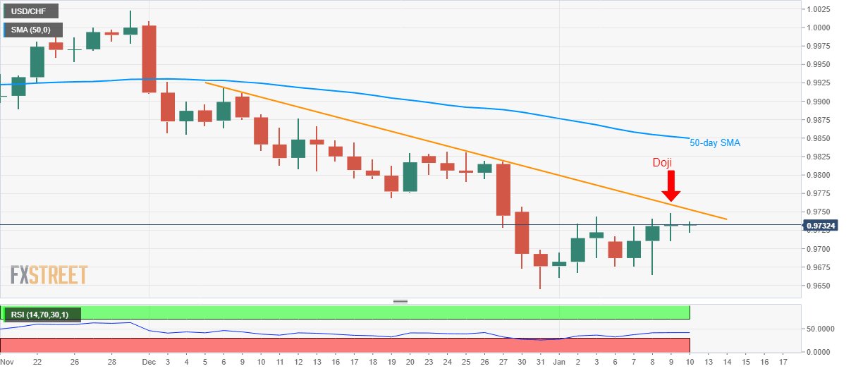 USD/CHF Technical Analysis: Sellers hopeful on Doji formation below monthly trendline