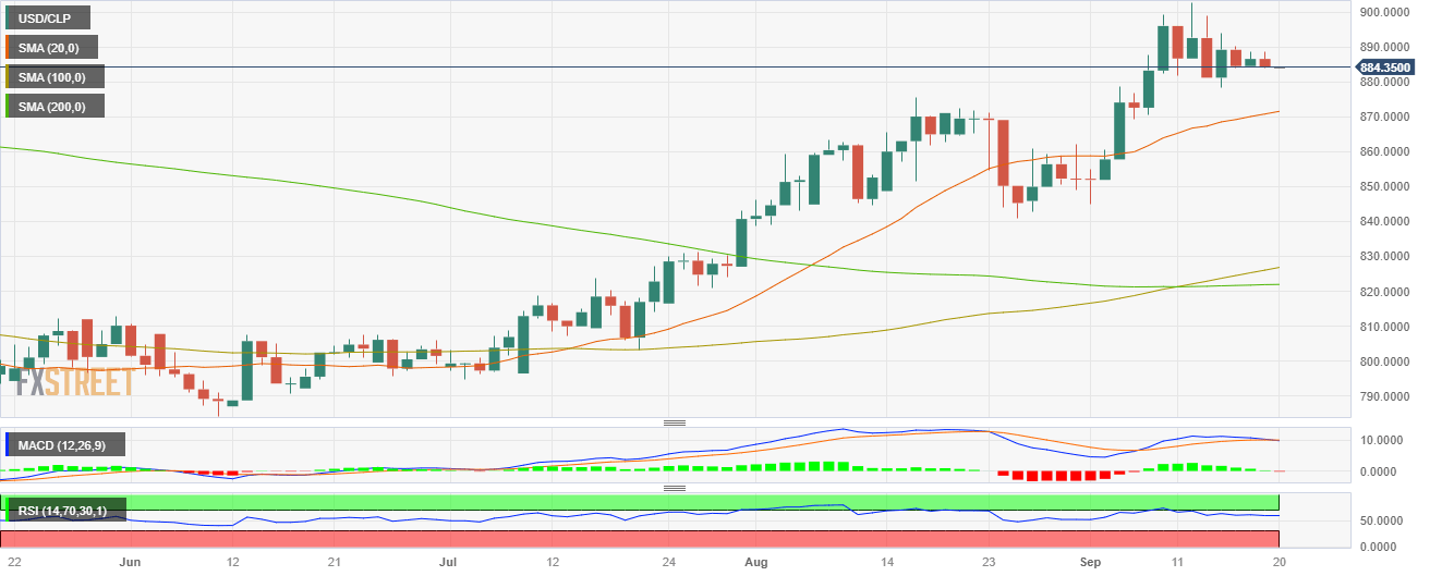 - USD/CLP trades neutral at 884.35, with technical indicators flat.