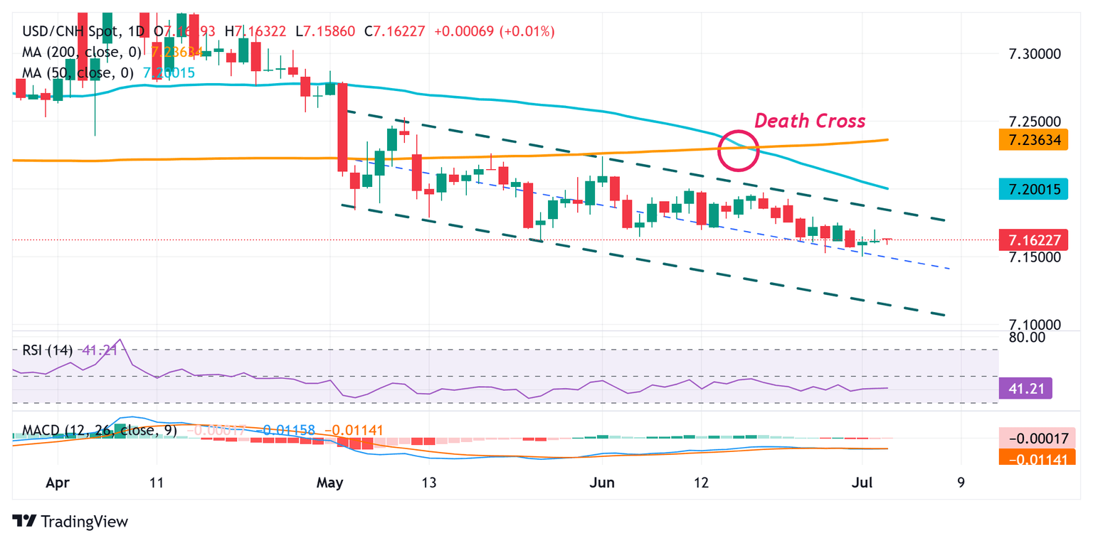 USD/CNH Price Forecast: Flat lines around 7.1620-7.1625; looks to US NFP for fresh impetus