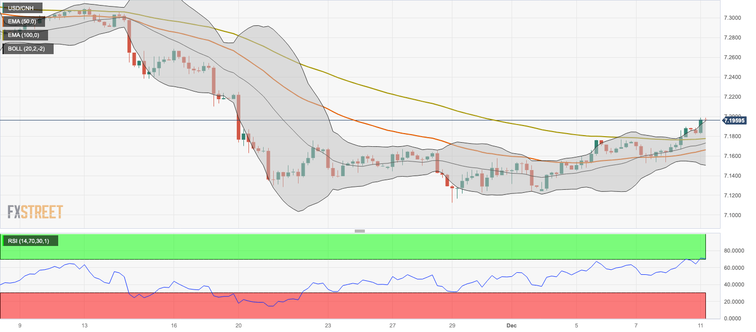 The USD/CNH pair holds positive ground around 7.1960 during the Asian session on Monday. The cautious mood in the market and the weaker-than-expected Chinese data lends some support to the pair. Investors await the US inflation data due on Tuesday ahead of the Federal Open Market Committee (FOMC) rate decision on Wednesday for fresh impetus. The markets anticipate the US central bank to hold the rate steady at its December meeting.