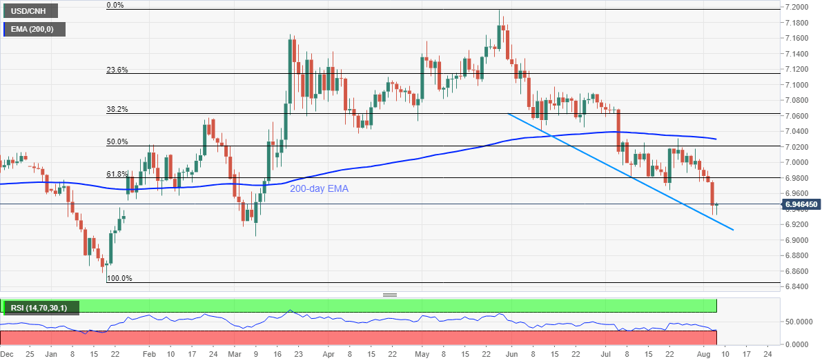 USD/CNH pulls back from multi-week low to 6.9458 amid the initial Chinese session on Thursday. The pair slumped to the lowest since March 09 the previous day. However, oversold RSI seems to have triggered the latest U-turn.