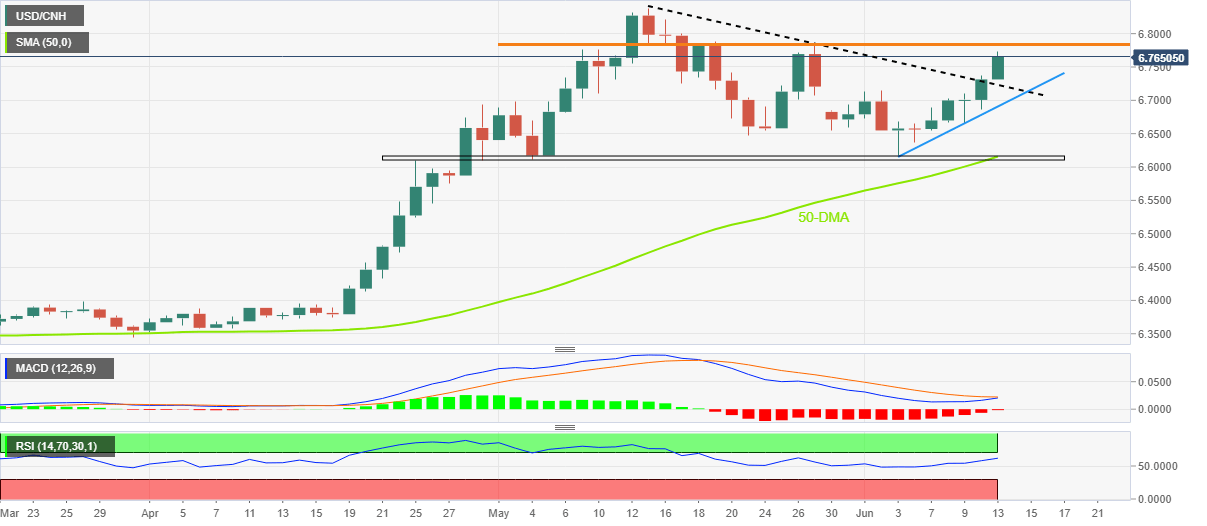 In doing so, the offshore Chinese yuan (CNH) pair justifies Friday’s upside break of a one-month-old resistance line, now support around 6.7220.