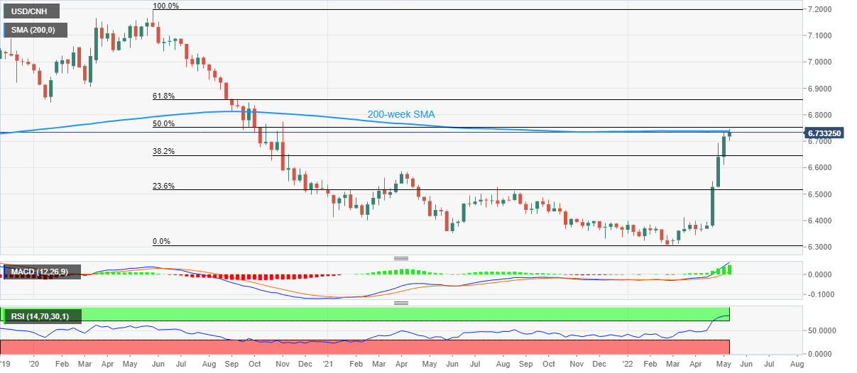 In doing so, the offshore Chinese yuan (CNH) pair crosses the 200-week moving average amid the market’s rush for risk safety, as well as anxiety ahead of China's trade numbers for April.