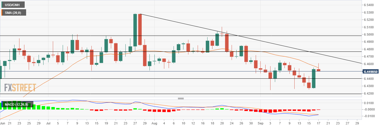 On the daily chart, the pair has broken the long term consolidation of $6.4525 on September 10 and touched the levels seen in June around $6.4270. USD/CNH recovered swiftly in the previous session’s upside momentum and pushed above $6.4600 weekly highs.