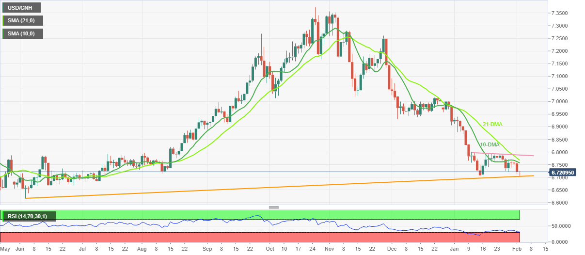 USD/CNH Price Analysis: Eight-month-old support line, oversold RSI test bears near 6.7200