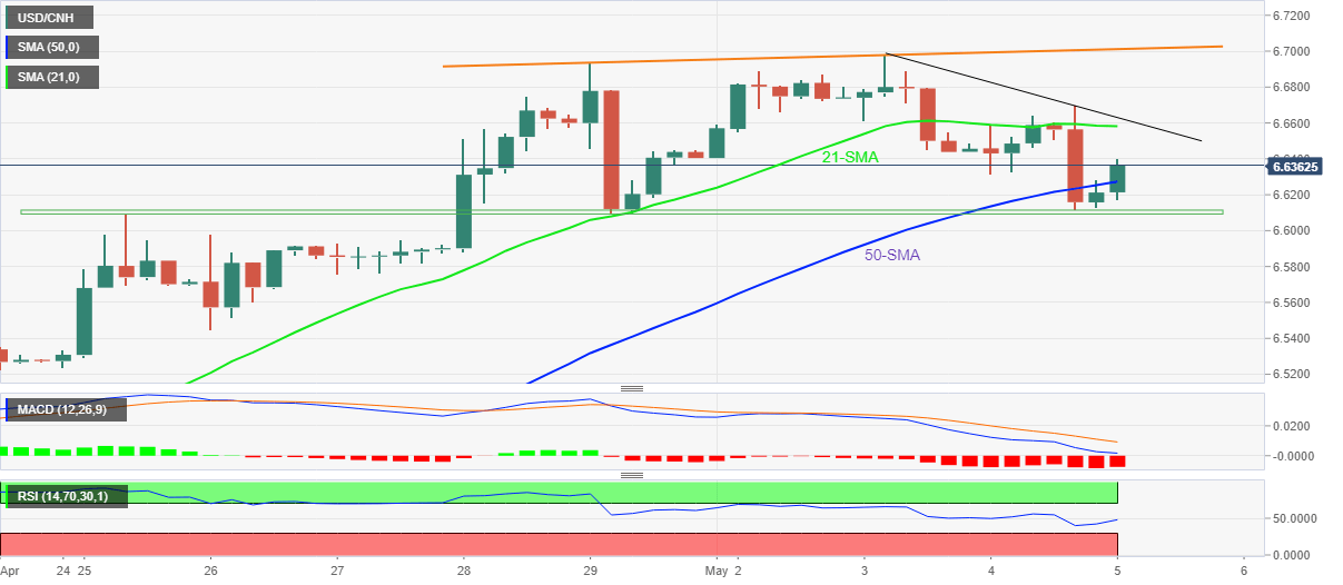 Given the firmer RSI support the latest recovery moves from the short-term key support, USD/CNH braces for a 21-SMA level of 6.6583.
