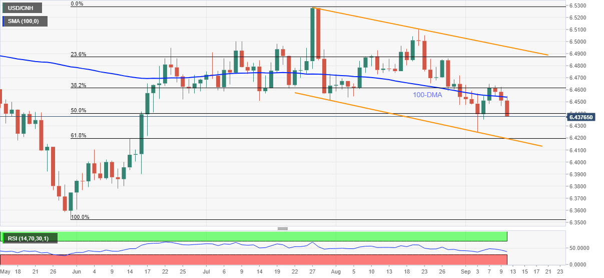 USD/CNH takes offers around 6.4400, down 0.17% intraday during the three-day fall ahead of Friday’s European session. In doing so, the offshore Chinese currency (CNH) pair stretches the latest failures to stay past 100-DMA.