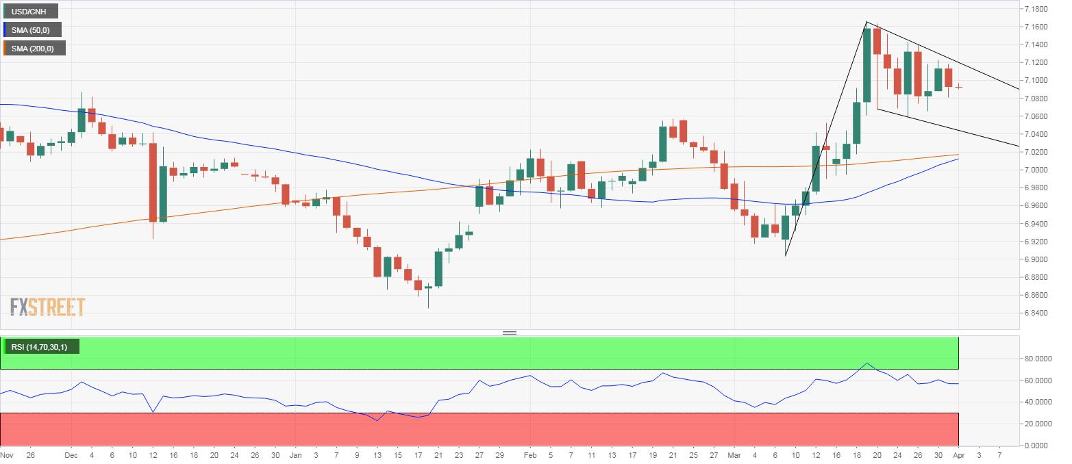USD/CNH remains trapped in a bull flag - a bullish continuation pattern, which would accelerate the upward move from the March 9 low of 6.9042 and open the doors for a test of resistance at 7.1956 (September high).