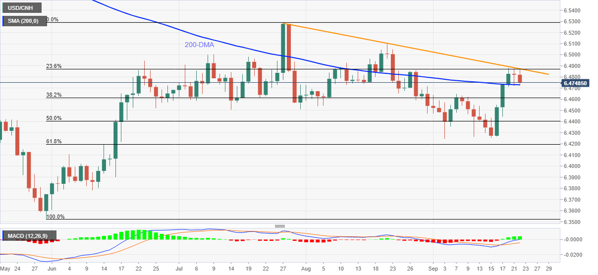 Even as 23.6% Fibonacci retracement of May-July upside adds strength to the upside hurdle, USD/CNH failures to break the 200-DMA level of $6.4730 joins bullish MACD signals to keep buyers hopeful.