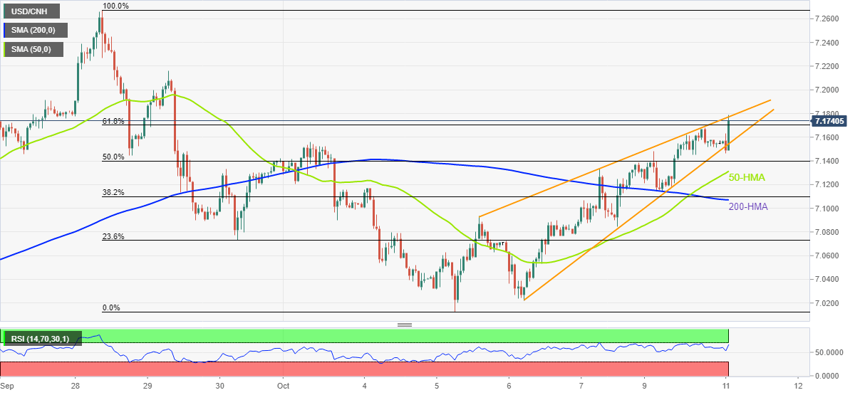 USD/CNH remains firmer for the fifth consecutive day, up 0.32% around 7.1760 during Tuesday’s Asian session. In doing so, the offshore China yuan (CNH) pair stays firmer past the 61.8% Fibonacci retracement of September 28 to October 05 moves amid firmer RSI.
