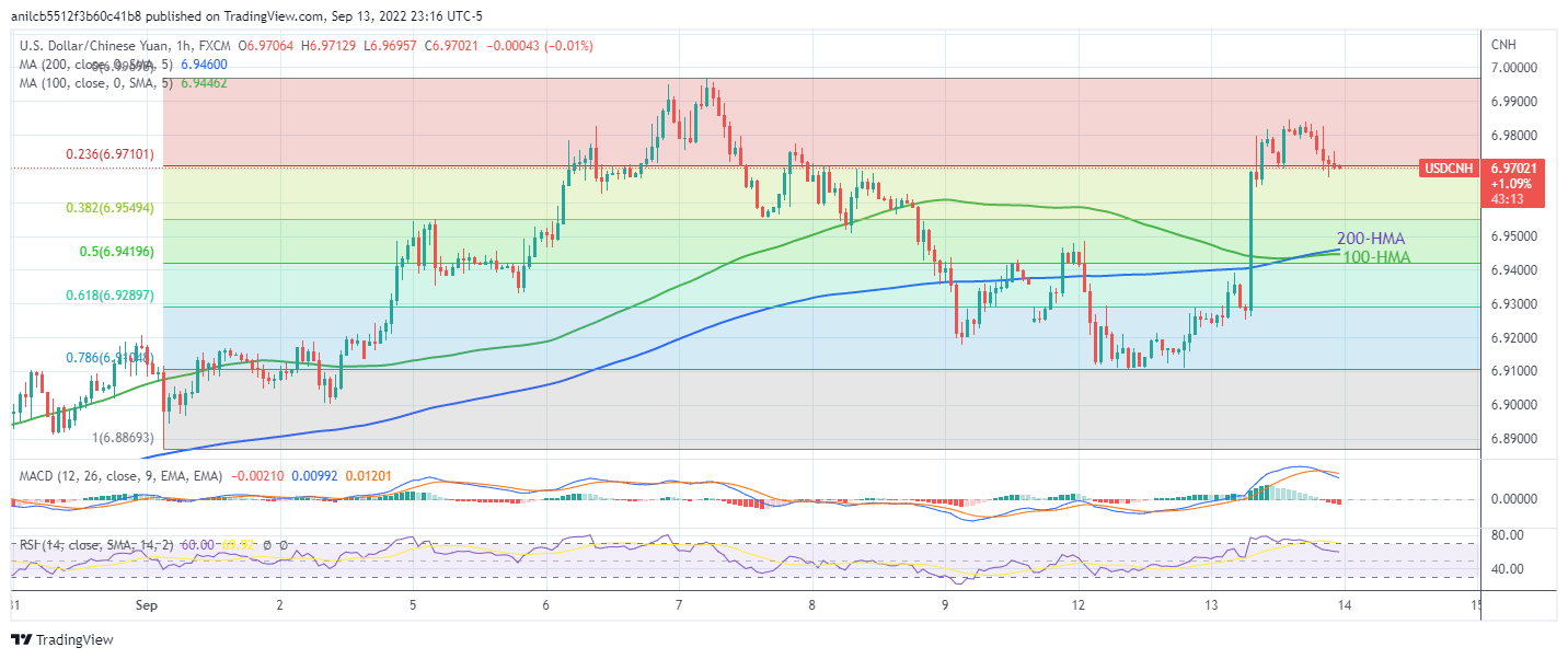 However, a convergence of the 100-HMA and the 200-HMA around 6.9450 appears a tough nut to crack for the USD/CNH bears.