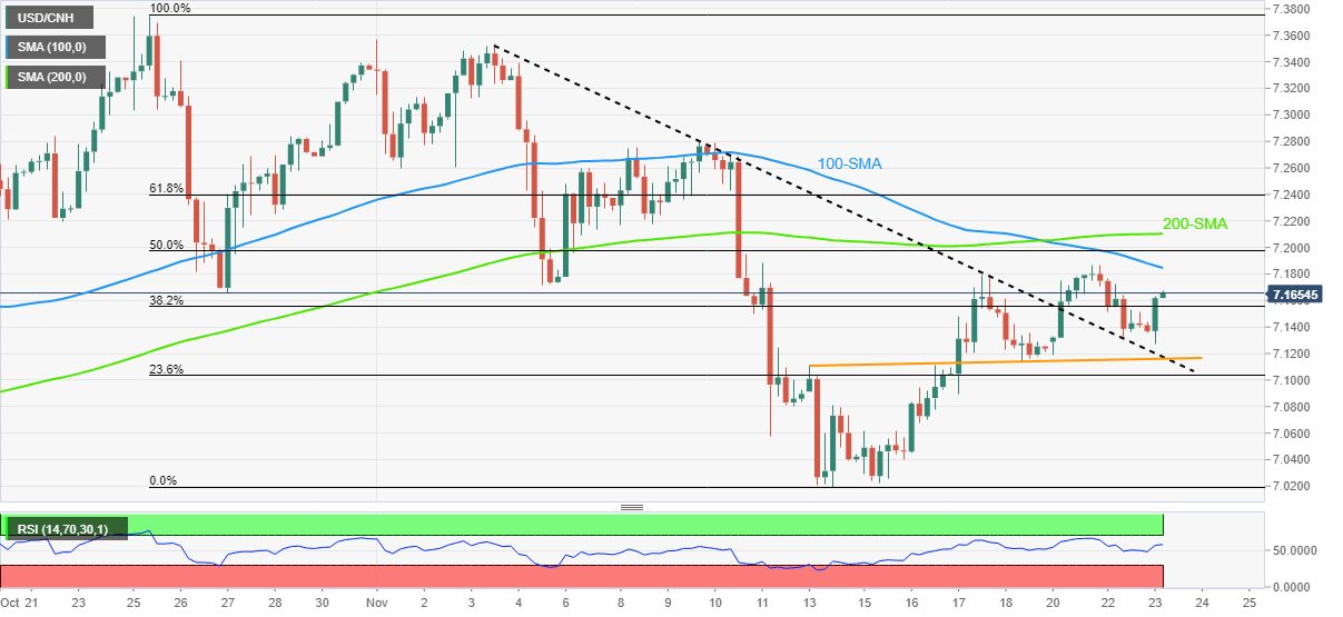 Should the USD/CNH bulls keep the reins past 7.2105, the 61.8% Fibonacci retracement of the pair’s downturn between October 25 to November 15, around 7.2400, will precede the November 09 swing high of 7.2800 to please the buyers.