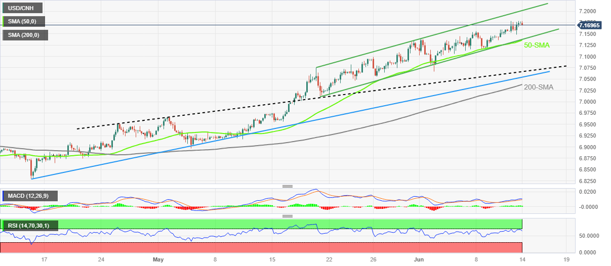 It’s worth noting that the overbought RSI conditions join the pre-Fed anxiety to challenge the USD/CNH traders within a one-week-old rising trend channel, currently between 7.2020 and 7.1350 at the latest. Adding strength to the 7.1350 support level is the 50-SMA.
