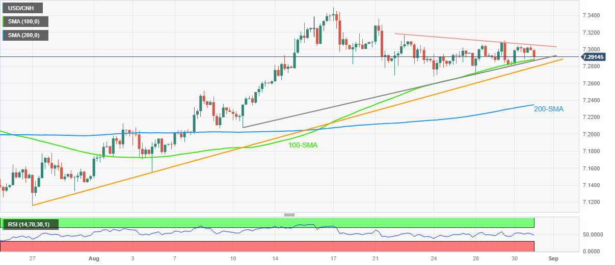 However, a convergence of the 100-SMA and an ascending trend line from August 10, restricts the immediate downside of the USD/CNH pair.