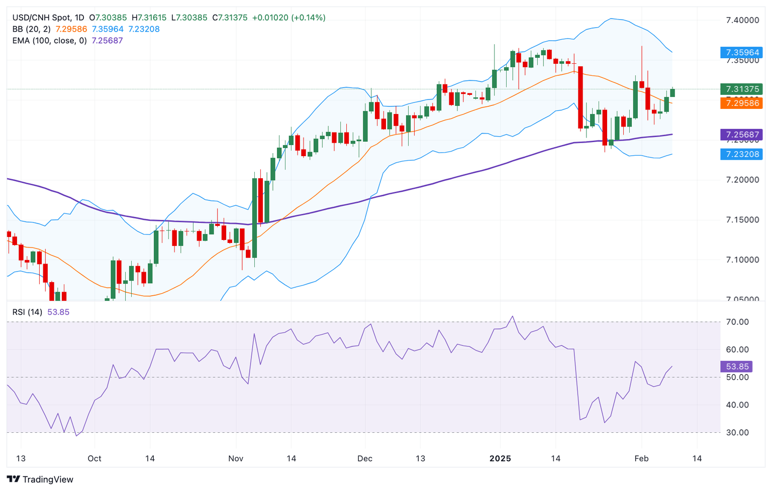 The upper boundary of the Bollinger Band of 7.3595 acts as an upside barrier for the pair. A decisive break above this level could pave the way to 7.3673, the high of February 3.