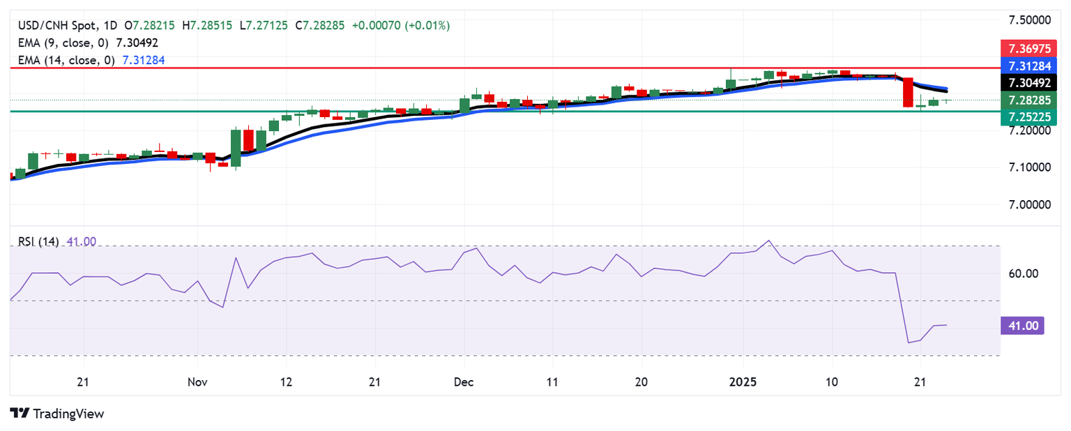 The USD/CNH pair trades near 7.2820 during Asian hours on Thursday. A review of the daily chart shows the pair remaining below nine- and 14-day Exponential Moving Averages (EMAs), signaling a weaker short-term price momentum.