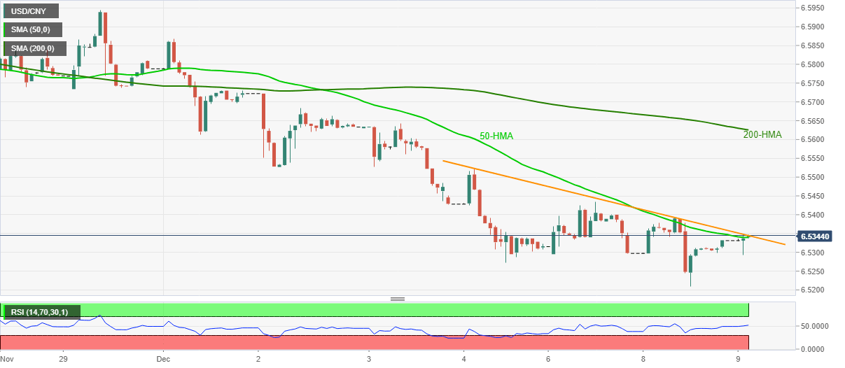 Even so, the pair needs to cross a confluence of 50-HMA and a falling trend line from Friday, near 6.5340/50, to convince buyers to attack last Wednesday’s low near 6.5530. Also acting as an upside barrier is the 200-HMA level of 6.5627.