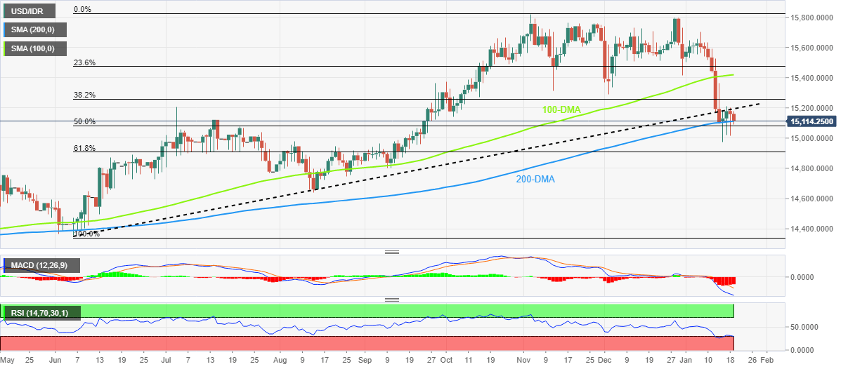 USD/IDR bears pressure on the key moving average as the key awaits the Bank Indonesia (BI) Rate decision during early Thursday. In doing so, the Indonesia Rupiah (IDR) extends the retreat from seven-month-old previous support to $15,100 by the press time.