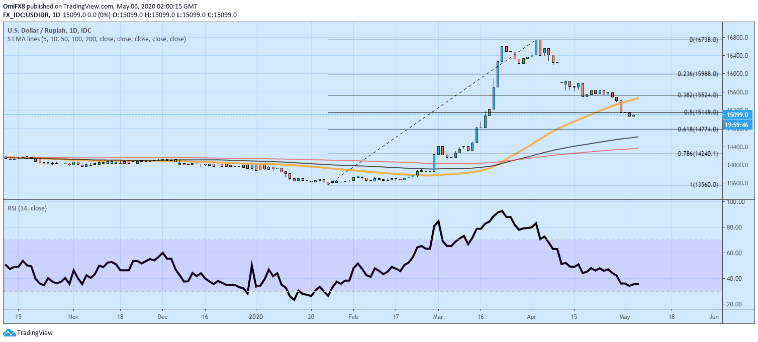 The Rupiah may rise further, as the USD/IDR's daily chart shows lower highs and lower lows setup, descending 5- and 10-day averages and a below-50 reading on the relative strength index (RSI).