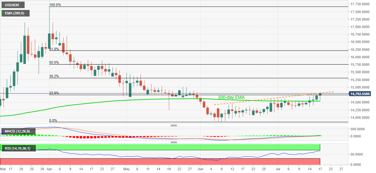 USD/IDR extends its north-run to 14,797, up 0.50% on a day, during the pre-European session on Friday. The quote crosses an upward sloping trend line from June 12 to print the new high since May 29.